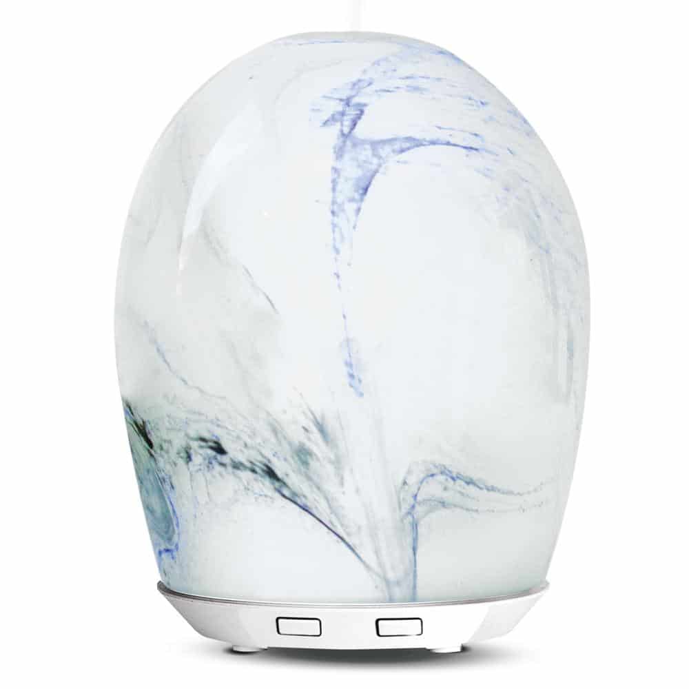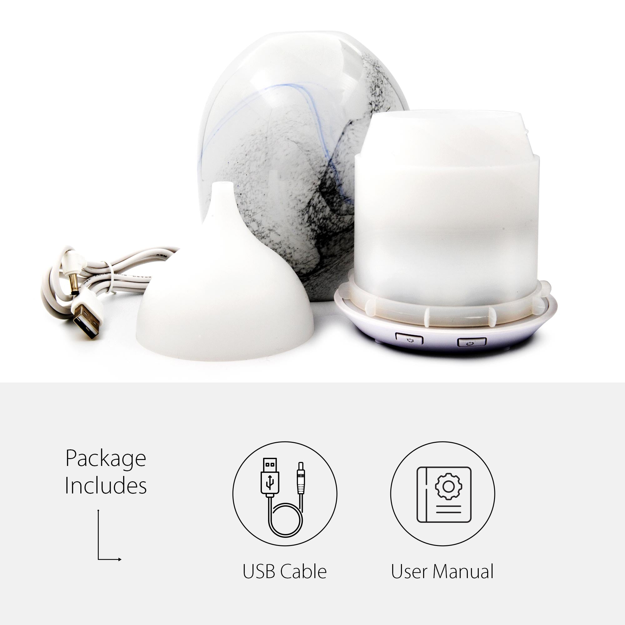Get all of the health benefits of your essential oils with this ultrasonic, no-heat, ultra-fine mist diffuser. An elegant marble look on hand hand-blown glass, this diffuser will enhance any room when used with our high quality essential oils. It's features make it an excellent choice for creating a healthful atmosphere for up to 6 hours. With light options of warm white, color rotating, or fixed color, you can use it as a lamp, mood lighting, or turn off the light all-together! This unit also has 2 operating modes: continuous and intermittent, with a continuous running time of 6 hours and has an auto-shut off sensor, ensuring you get the full expected life of this diffuser. Standing at 6 inches tall, this table-top diffuser provides up to 400 square foot range of dispersion, making it a great choice for any room in your home or office.